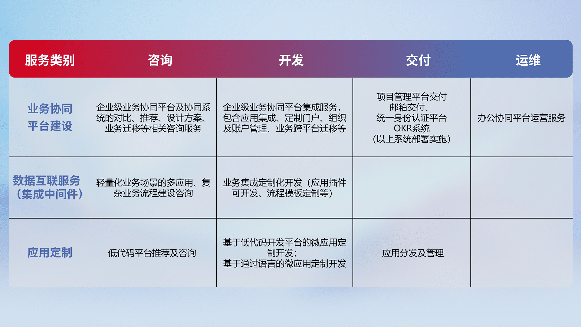 针对钉钉、、企微、、IDaas等平台级产品提供产品的规划、、、、方案、、、交付、、、、定制化开发等服务,,,实现如统一协同办公、、、、智能客户服务、、、、混合会议管理、、智能数据查询、、、、等业务场景,,实现数字化转型。。