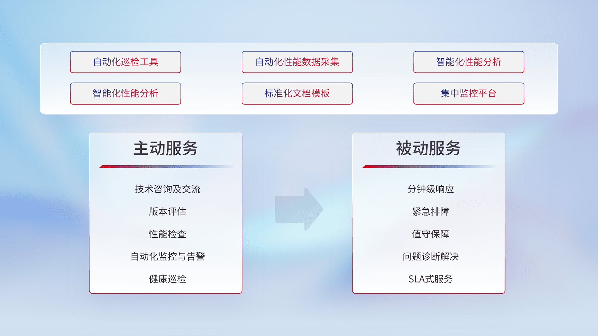 智能化工具和标准化文档,,保障服务质量,,,提供主动服务(包含技术咨询、、、、版本评估、、、、性能检查、、、、自动化监控与告警、、、、健康巡检)和被动服务包含(分钟级响应、、、、紧急排障、、、值守保障、、、问题诊断解决、、、SLA服务)。。。